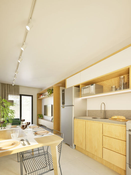 Com 47m² de arquitetura inteligente e bem distribuída, conta com dois dormitórios, banheiro completo e área social integrada à cozinha e lavanderia, garantindo funcionalidade real para o dia a dia. A varanda externa amplia a experiência de morar, conectando interior e exterior com leveza e fluidez.